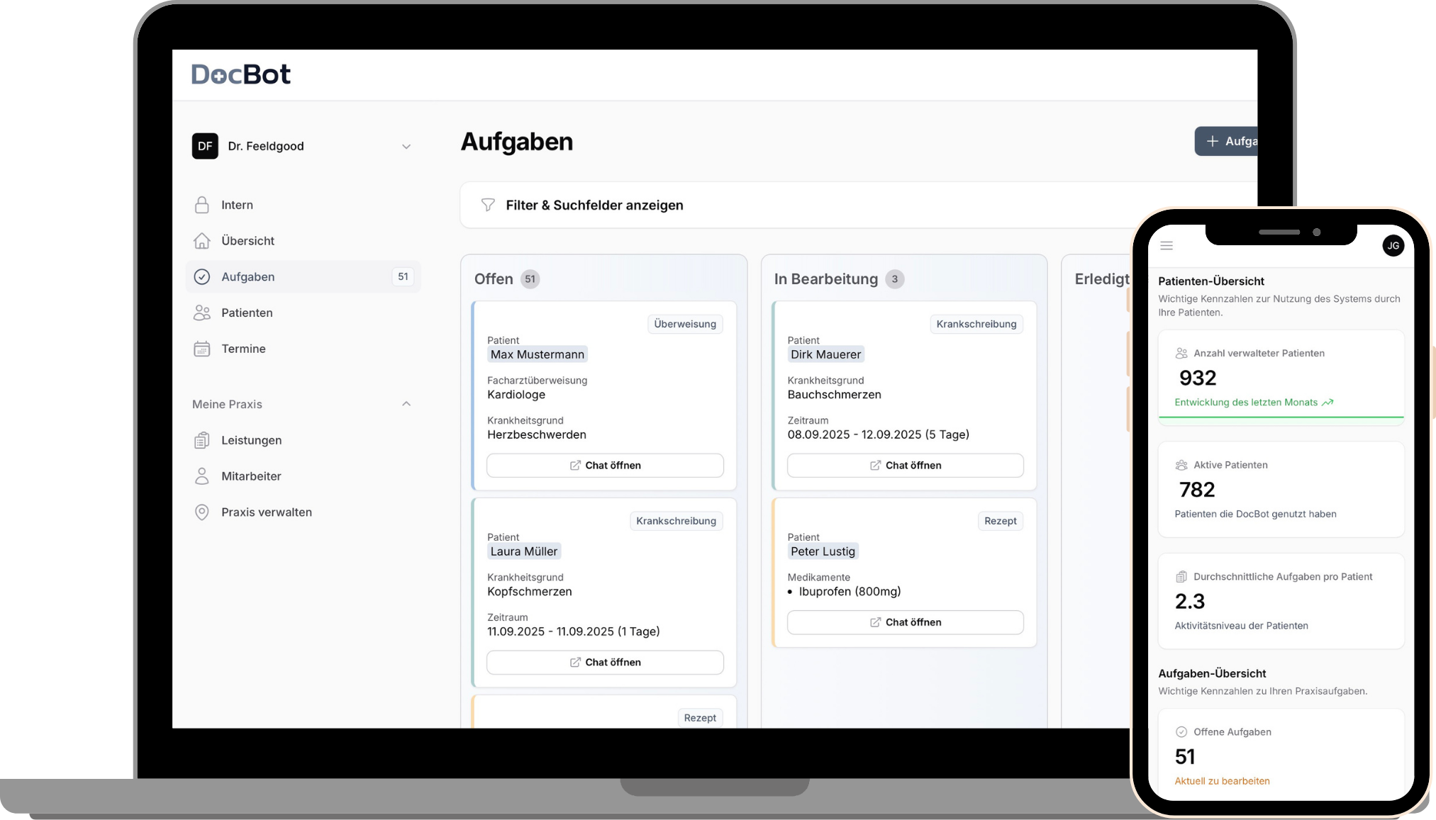 Die künstliche Intelligenz von DocBot nimmt Patientenanfragen automatisch über den Chat und Telefon entgegen, analysiert die Anliegen und organisiert die Anfragen in der Praxissoftware – ganz ohne ständiges Klingeln des Telefons.